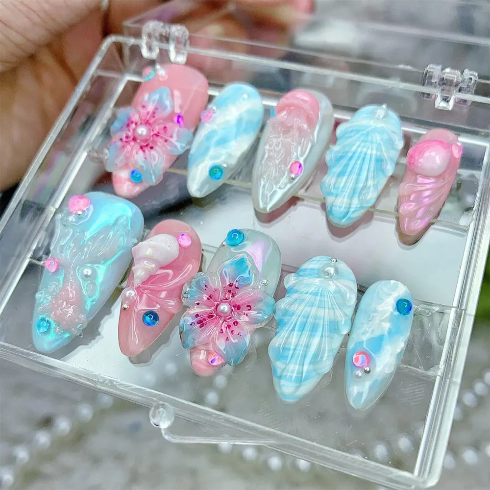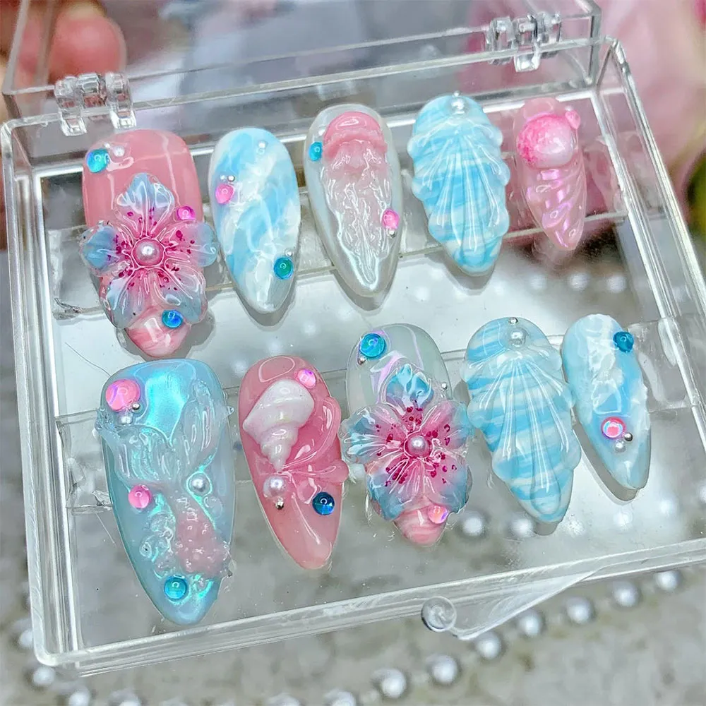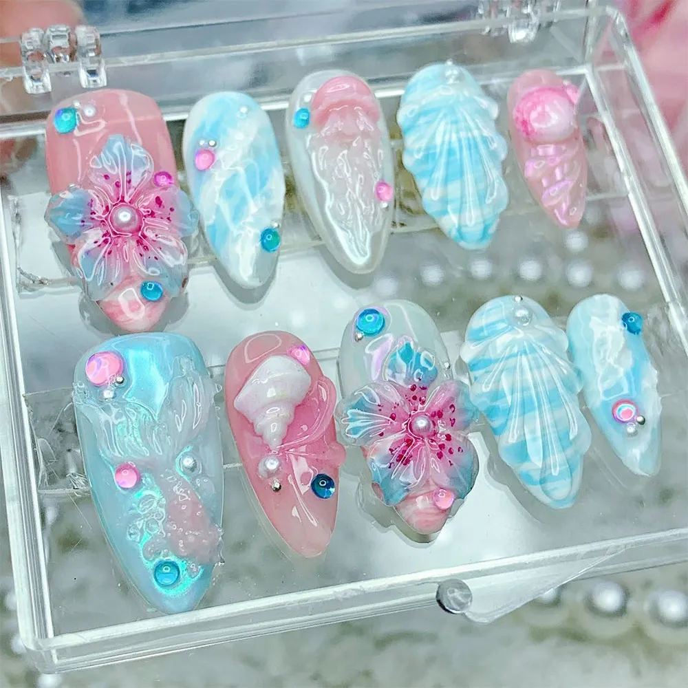 The artistry on this press on nails set is truly next-level. Textured shell fan reliefs rendered in shimmering white and aqua blue span across multiple nails, giving each one a sculptural, almost glass-like depth. The accent nails feature breathtaking 3D floral blooms — translucent petals in blended pink and blue with deep fuchsia glitter detailing and a lustrous pearl center — creating a dimensional floral effect that looks hand-sculpted. Iridescent sequin confetti in pink, blue, and teal is scattered across the set like ocean sparkles, and tiny crystal rhinestones add subtle glitter accents that catch the light from every angle. The aurora shimmer finish gives these fake nails an otherworldly, holographic depth that photographs stunningly.