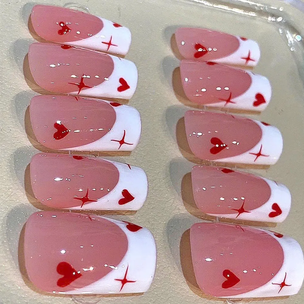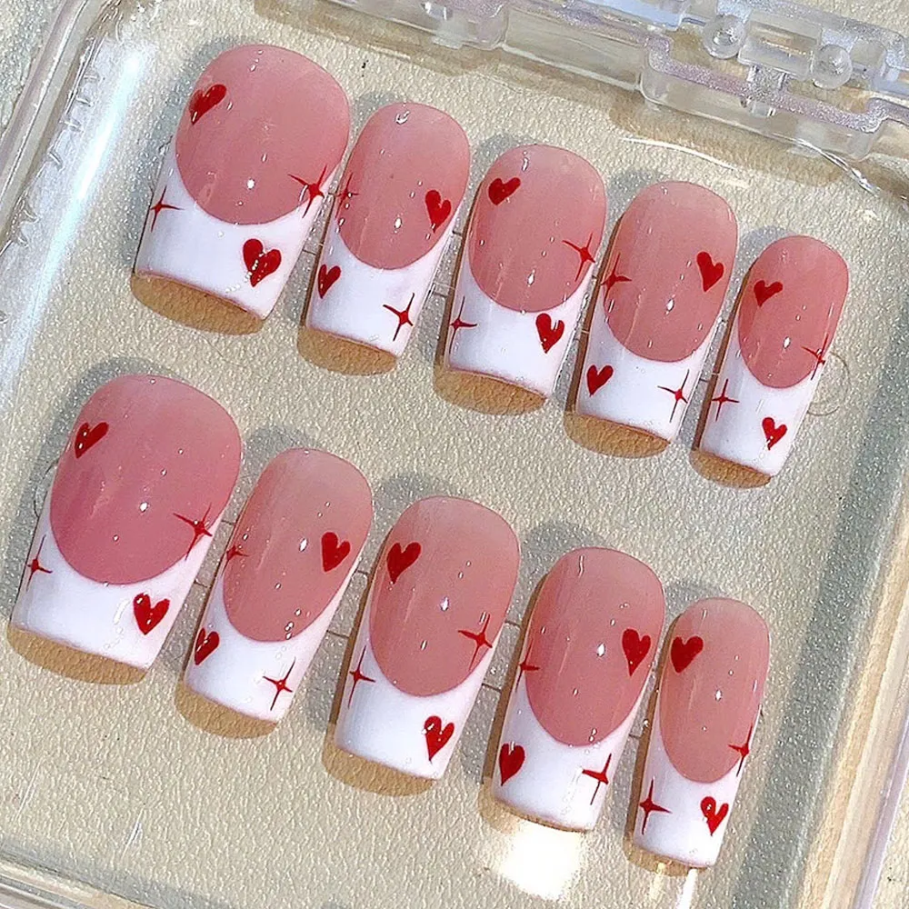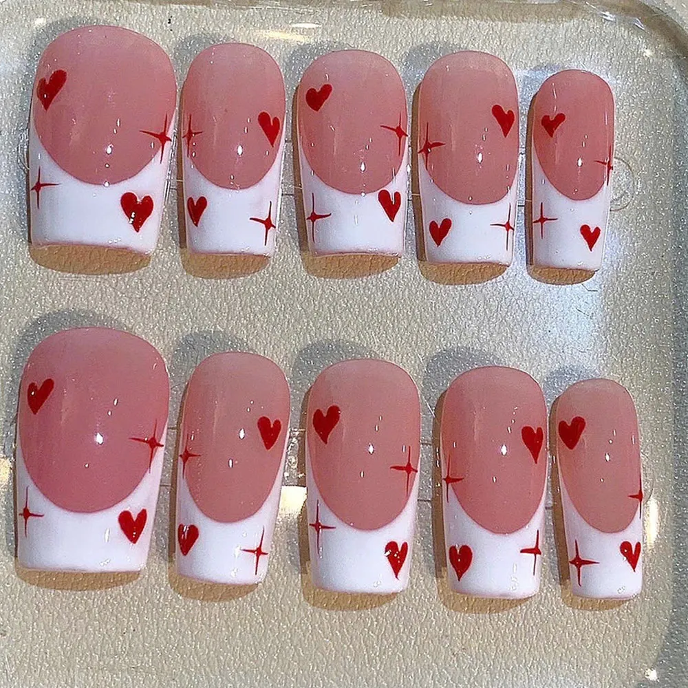 This gorgeous set features a classic French tip reinvented with a soft Valentine’s twist: a warm dusty rose-pink base melts into a crisp bright white tip, creating a modern take on the timeless French manicure. Scattered across each nail are delicate red heart motifs and sparkling four-pointed star sparkle accents, hand-painted with a light, airy touch that feels sweet without being overwhelming. The hearts vary gently in size and placement across each nail, giving the set a natural, artisan feel — as if each nail was individually crafted with care. The white tips catch the light beautifully against the warm pink base, and the glossy top coat finish adds a polished, salon-quality shine that elevates the entire look.