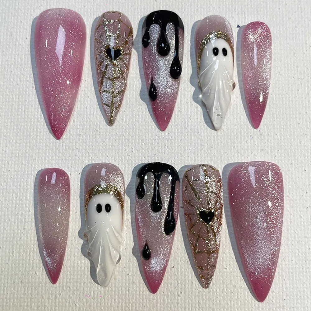 Built on a dreamy dusty pink shimmer base that catches light like moonlit silk, each nail is packed with detail. A silvery holographic glitter overlay gives the entire set an ethereal, glass-like glow that shifts beautifully with every movement. Accent nails feature bold 3D white ghost figures with tiny black dot eyes — adorably spooky and impossibly charming — while other nails showcase dramatic black drip designs that melt down from the tip like liquid shadow, creating a fierce contrast against the soft pink. Gold marble-like veining weaves through select nails, adding a luxe, editorial edge to the overall look. The combination of soft glam and dark details creates a perfectly balanced aesthetic — cute enough to wear daily in October, bold enough to steal the show at any Halloween event.