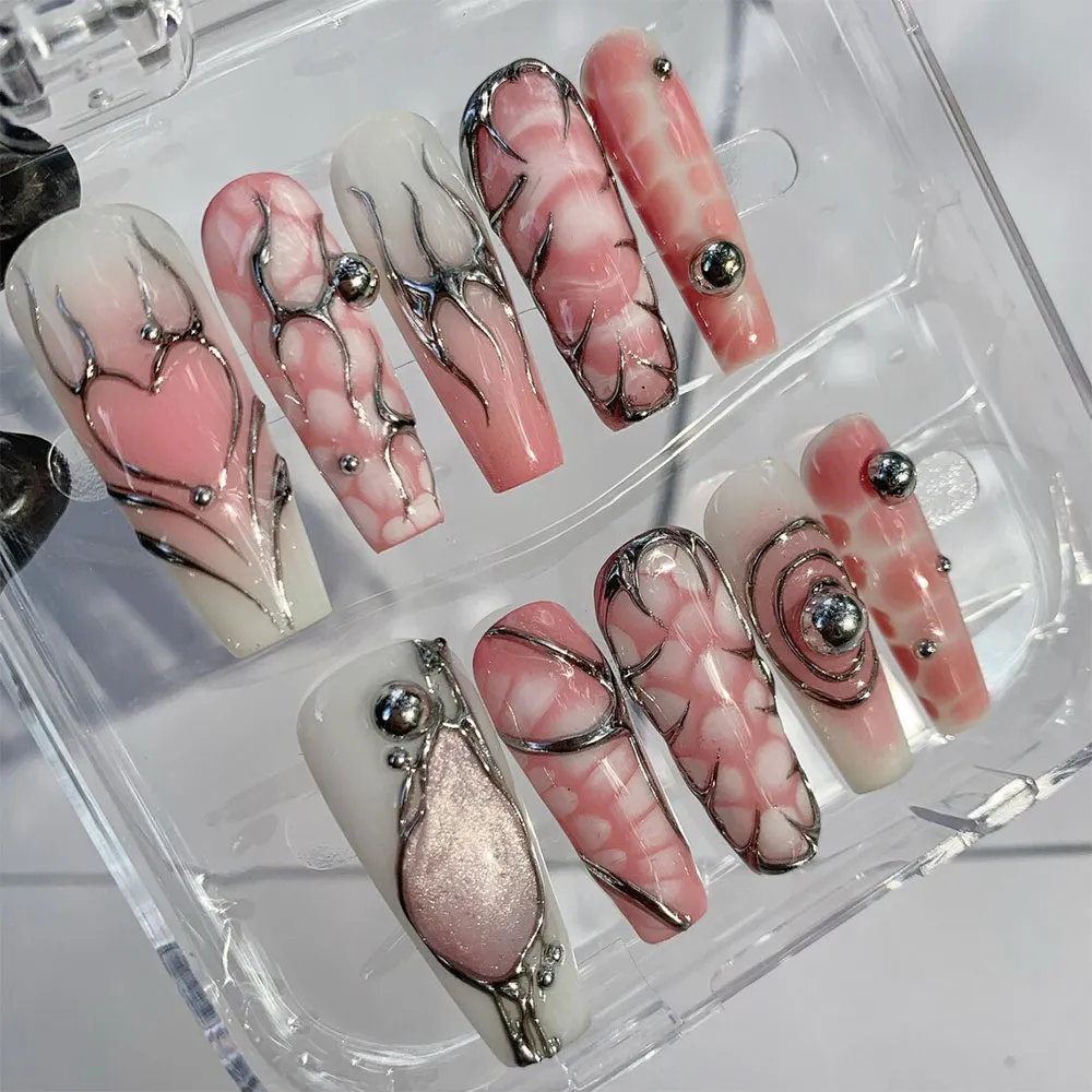 The set is built on a soft white and blush pink base with a dreamy, cloud-like watercolor texture that shifts between milky white and soft rose across each nail. Raised 3D silver chrome wire art weaves organically across every press on nail — creating flowing branch, thorn, and vine-like structures that feel like liquid metal sculpted by hand. A romantic heart motif framed in silver wire sits as the standout design on the accent nail, radiating soft feminine energy with an edgy metallic twist. A pearlescent pink teardrop gem encased in silver wire adds a luxurious jewel-like focal point, while silver ball bead accents dot the set like tiny planets. A concentric silver circle design with a chrome ball center creates a hypnotic, orbital effect that brings a futuristic dimension to the overall look. Every detail of these press on nails feels intentional, crafted, and utterly unique.