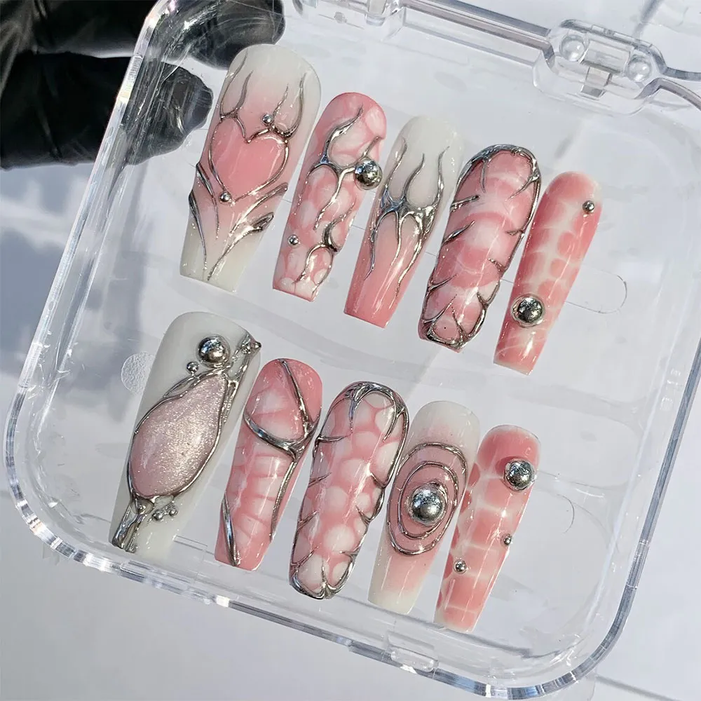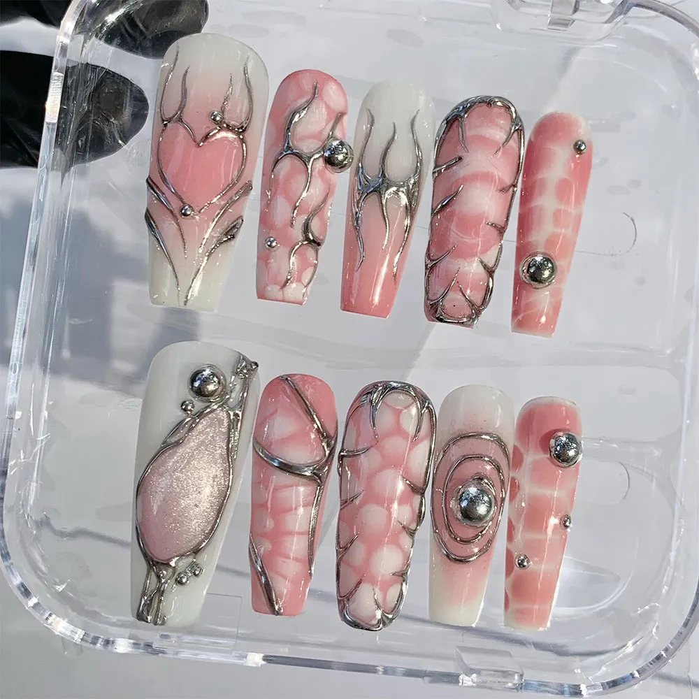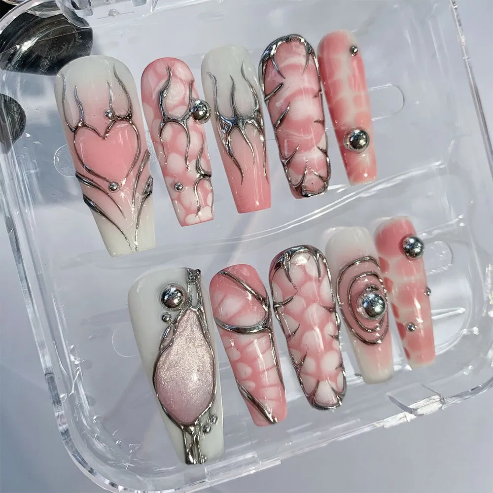 Soft, dreamy, and impossibly cool — these Pink Heart press on nails are the perfect blend of romantic femininity and futuristic edge. Featuring a stunning mix of blush pink cloud art and sculptural silver chrome detailing, these fake nails deliver a look that is both tender and fearlessly stylish. This is Y2K dark romance at its most beautiful.