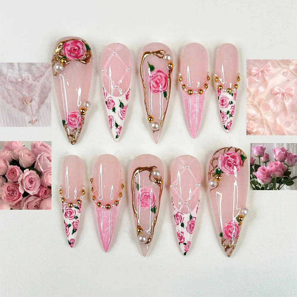 Every nail in this press on nails set tells a story of timeless romance. A delicate blush pink base glows with a soft, glossy finish, serving as the perfect canvas for lush hand-painted pink roses with vivid green leaves — rich in color and full of painterly detail. Dripping white chrome line art cascades down each nail like melted candlewax or flowing silk ribbons, adding a modern artistic edge to the otherwise romantic design. Twisted gold vine details curl elegantly across select nails, while a stunning 3D sculpted rose in full bloom anchors the set’s most dramatic accent nail. Pearl embellishments in varying sizes are scattered like a strand of jewelry falling across the nails, paired with gleaming gold bead chains that evoke the feel of a delicate necklace draped over porcelain fingertips. The combination of florals, pearls, and gold creates an aesthetic that sits perfectly at the intersection of coquette, vintage romance, and dark feminine elegance.