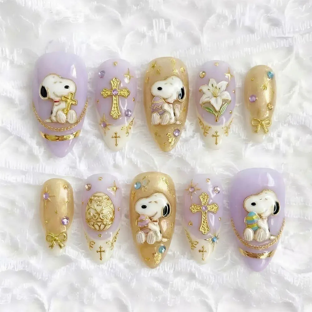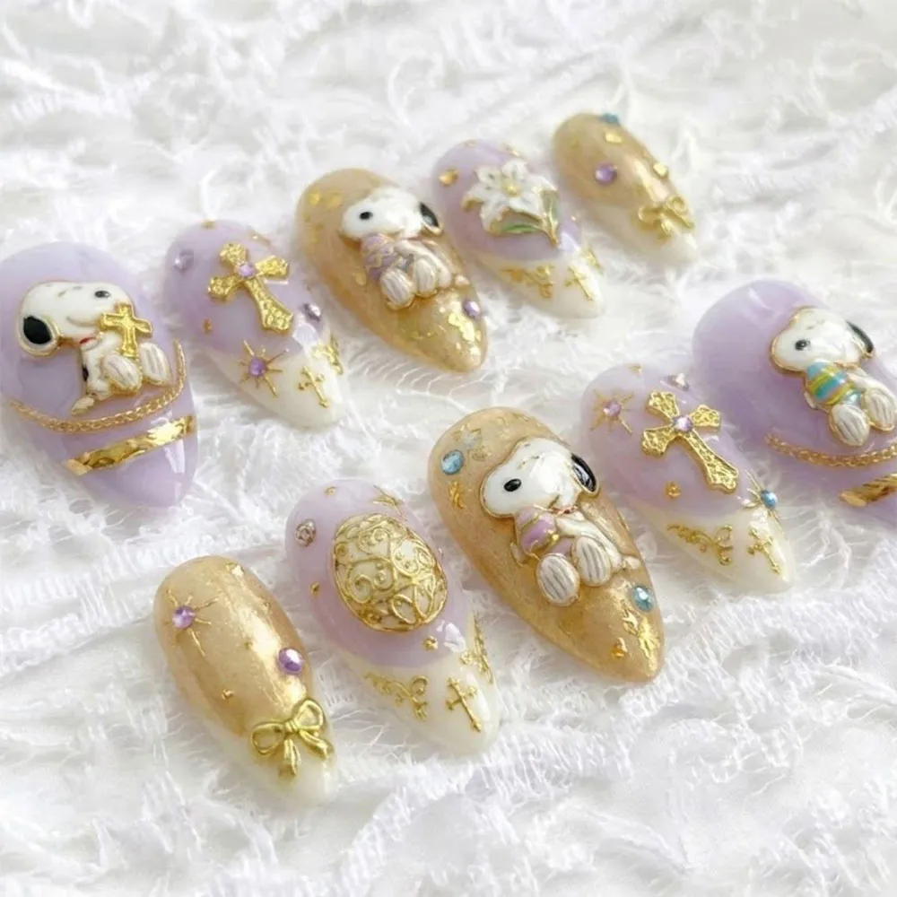 Each set is lovingly handmade with premium gel formula, featuring adorable Snoopy motifs rendered in rich purple and gleaming gold tones that give this whimsical design an elevated, luxury quality that is far beyond anything you have seen before. Intricate 3D cross pattern details add a meaningful, festive depth to the design, beautifully complementing the playful Snoopy artwork with a touch of Easter spirituality and seasonal charm. These fake nails are crafted with meticulous precision, delivering a flawless, salon-quality finish that makes every Snoopy detail and gold accent shine with a brilliant, jewel-like radiance.
