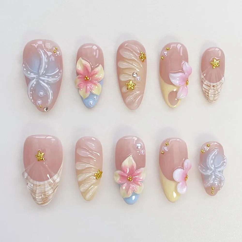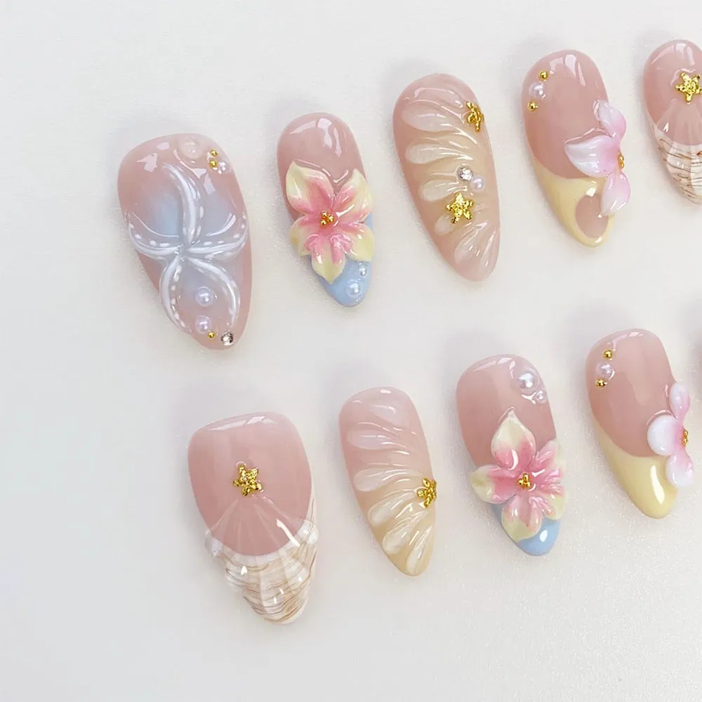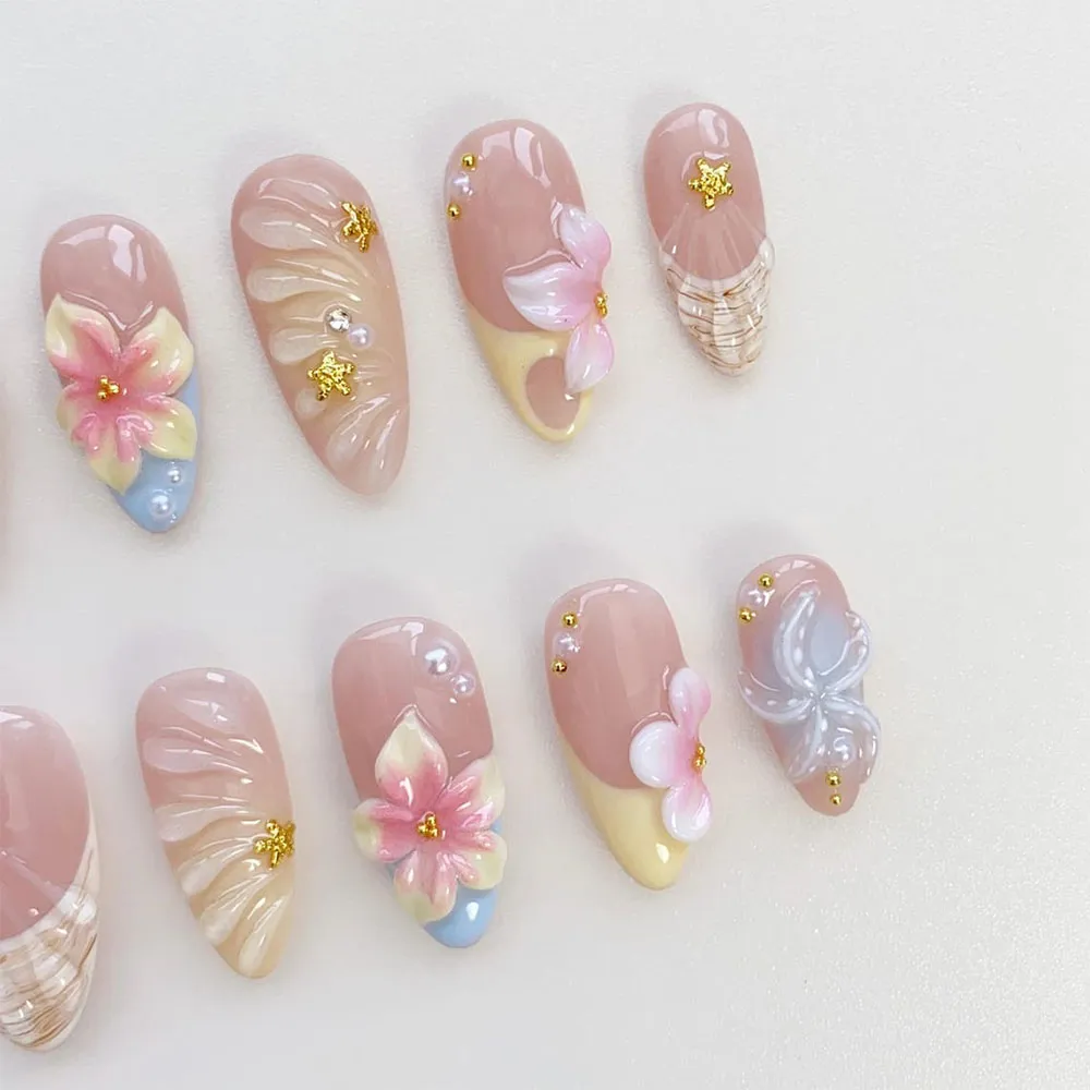 Starfish Bloom Press On Nails – Summer Floral Shell Fake Nails | SE095