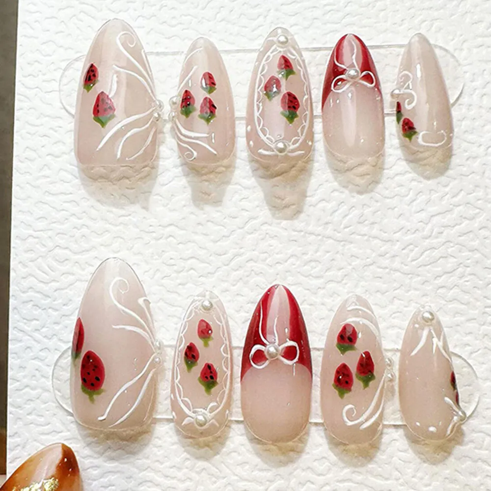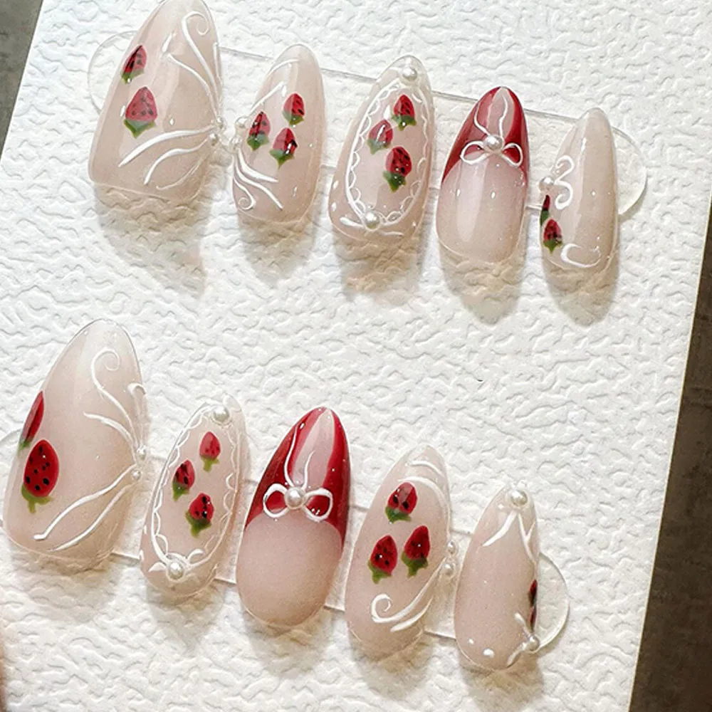 These press-on nails are a perfect match for summer picnics, beach days, birthday parties, café dates, kawaii fashion events, Valentine’s Day gatherings, or any occasion that calls for a look that is as sweet and joyful as a basket of fresh strawberries. Style them with a strawberry- printed sundress, a soft pink co-ord, a white linen set, or your favorite cottagecore outfit — these press-ons bring an instant burst of fruity, feminine bliss to every look.