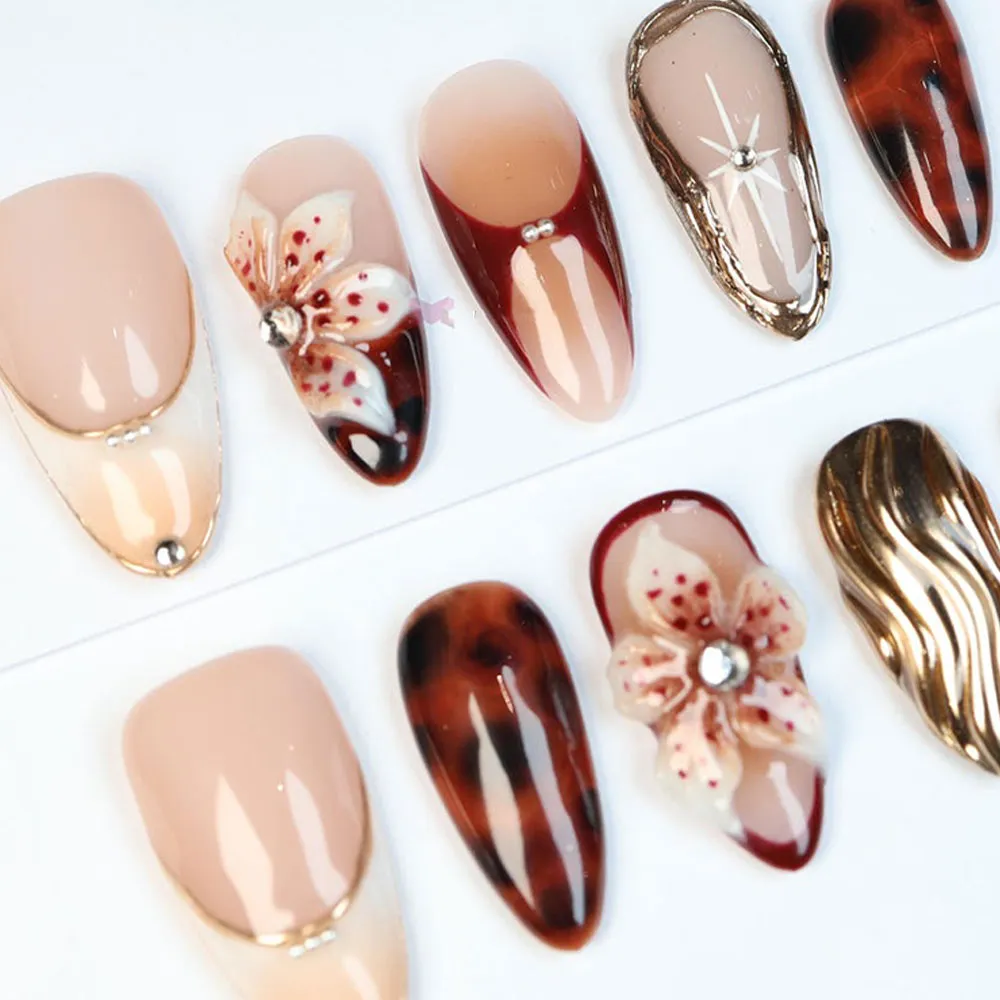 Each set features the iconic tortoise shell pattern in rich amber, warm brown, and deep caramel tones, beautifully adorned with hand-sculpted 3D floral accents that bring an unexpected softness and romance to the boldness of the tortoise design. The warm autumn palette makes these fake nails feel perfectly at home in the fall season, while the fully reusable premium construction ensures a flawless, salon-quality finish you can enjoy again and again. Every detail is crafted with precision, making each set a wearable collectible that stands apart from anything else in your nail wardrobe.
