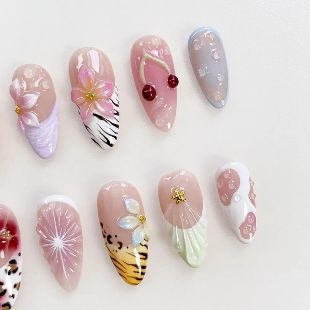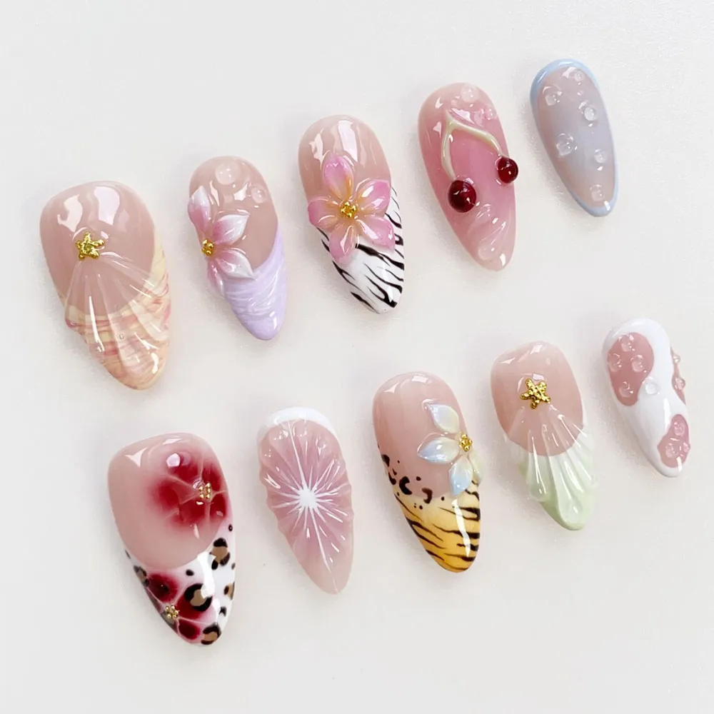 The design diversity on this press on nails set is breathtaking. A translucent shell fan relief nail in warm peach-champagne tones with a delicate gold starfish charm opens the collection with quiet coastal elegance. A 3D pink floral bloom with gold center bead floats over a soft lavender shell texture nail, while a second deeper pink flower with gold stamen sits beautifully against a bold black and white zebra stripe accent nail — wild and romantic in perfect tension. Glossy 3D red cherry duo with gold stem charm on a soft nude-pink base brings a sweet retro summer touch. A soft blue bubble gel nail with iridescent clear droplets adds a cool, ethereal contrast to the warmer tones. The lower row reveals even more personality — a dramatic red floral bloom with gold bead center sits over a leopard print base in rich brown and cream, a starburst white line art nail radiates on nude for a celestial editorial moment, an iridescent blue petal flower with gold starfish charm glows over a vibrant tiger stripe yellow nail, and a translucent shell fan on white with scattered pink dots and pink bubble accents closes the set with soft textural charm. These fake nails are a complete maximalist fantasy.